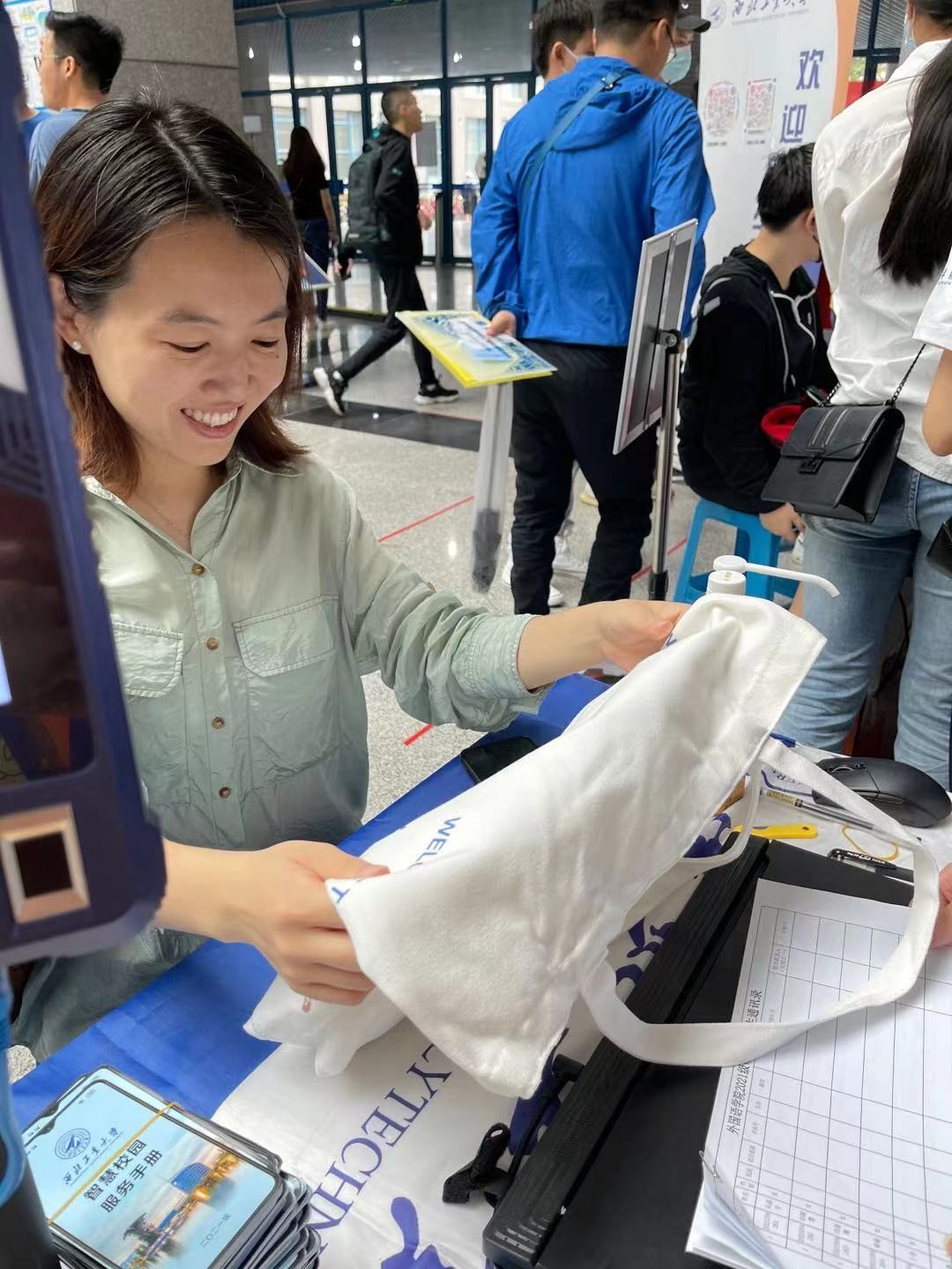 定制帆布袋一个,印制西工大logo的口罩7片,入学指南一份和经典书籍一本,让每一位踏入熟女自拍