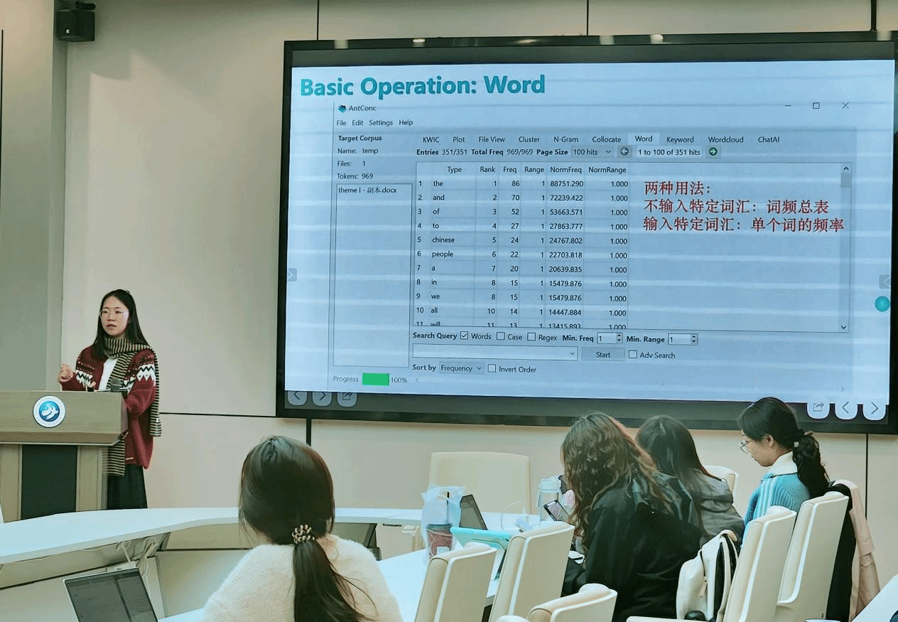 2025级硕士研究生洪纹玥以语料库研究为主题,分享AntConc工具的应用技巧。她结合具体研究案例,演示如何通过该工具进行目标词语检索、搭配频次分析及关键词提取,直观展示工具在语言研究中的实用价值,为有相关研究需求的同学提供新的技术思路。