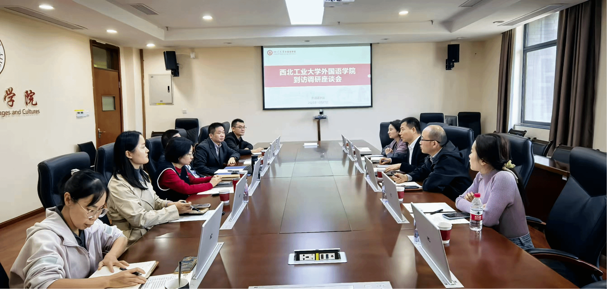 调研期间,文学书记简要介绍了学院党建工作、历史沿革、学科发展、人才培养等情况。王高祖书记结合近期学院在学科建设、人才引进、考核激励等方面的工作情况,交流了做法与经验。随后,双方围绕党建工作开展、外语学科建设、学生工作推进、品牌活动创建及外语人才培养质量提升等关键问题进行了研讨交流。双方表示,将以此次调研交流为契机,持续加强交流互鉴与沟通合作,共同在党建工作、学科建设及育人质量上取得新突破。
